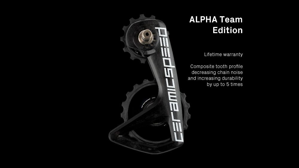 Further Drive Technology → Customizable spring tension settings for optimal setup → Available with ALPHA disc pulleys featuring ADR bearing protection or alloy 5-spoke pulleys and standard handbuilt Ceramic Speed bearings → ALPHA disc option available with an oversized logo, designated as Team Edition