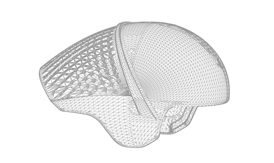 The rear of the helmet has a dimpled surface to trap an air layer around the tail of the helmet and improve aerodynamic performance.