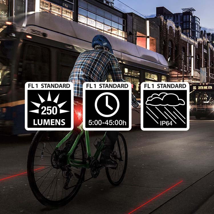- 250 lumen Daylight Visible tail light with Laser Lanes