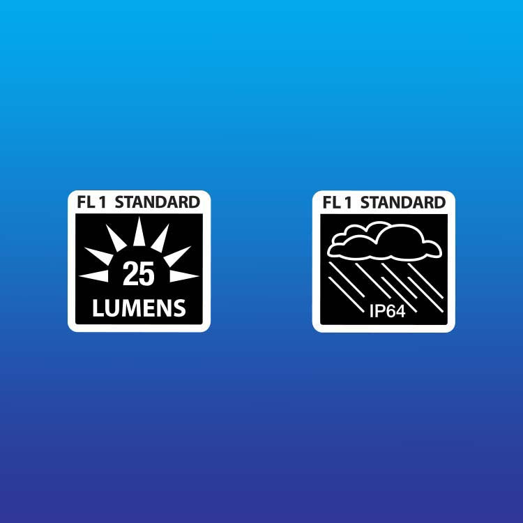 Tested to perform meeting FL1 Standards in lumen output and water/dust resistance.
