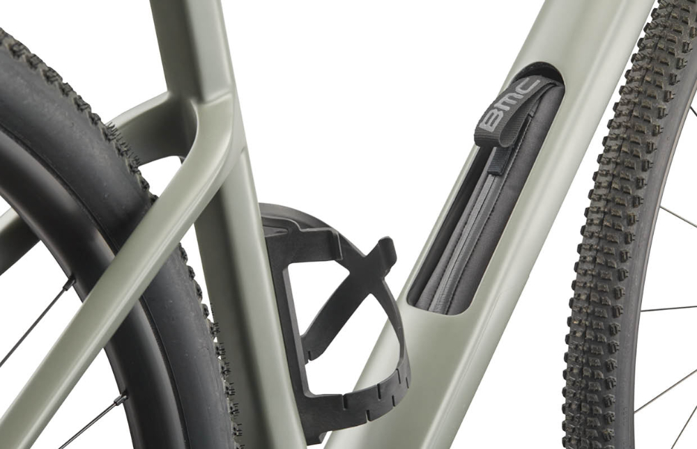 We obsessed over every detail of the downtube to optimally integrate internal storage. Inside, there's a purpose-designed, water-repellent pouch for on-ride carry, neatly stashed beneath a drag-reducing bottle cage.