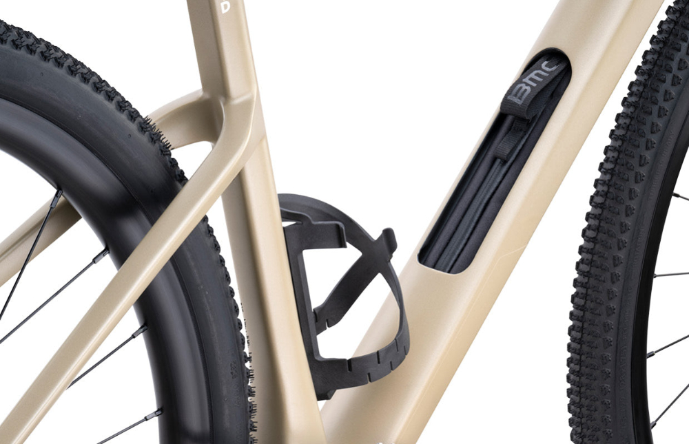 We obsessed over every detail of the downtube to optimally integrate internal storage. Inside, there's a purpose-designed, water-repellent pouch for on-ride carry, neatly stashed beneath a drag-reducing bottle cage.