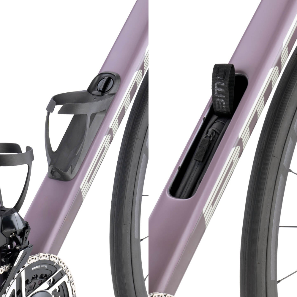 We obsessed every detail of the downtube to optimally integrate internal storage. Inside, there's a purpose-designed water-repellent pouch for on-ride carry. Neatly sealed under drag-reducing bottle cages.