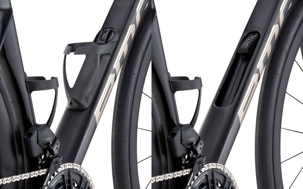 We obsessed every detail of the downtube to optimally integrate internal storage. Inside, there's a purpose-designed water-repellent pouch for on-ride carry. Neatly sealed under drag-reducing bottle cages.