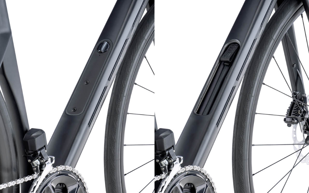 We obsessed every detail of the downtube to optimally integrate internal storage. Inside, there's a purpose-designed water-repellent pouch for on-ride carry. Neatly sealed under drag-reducing bottle cages.