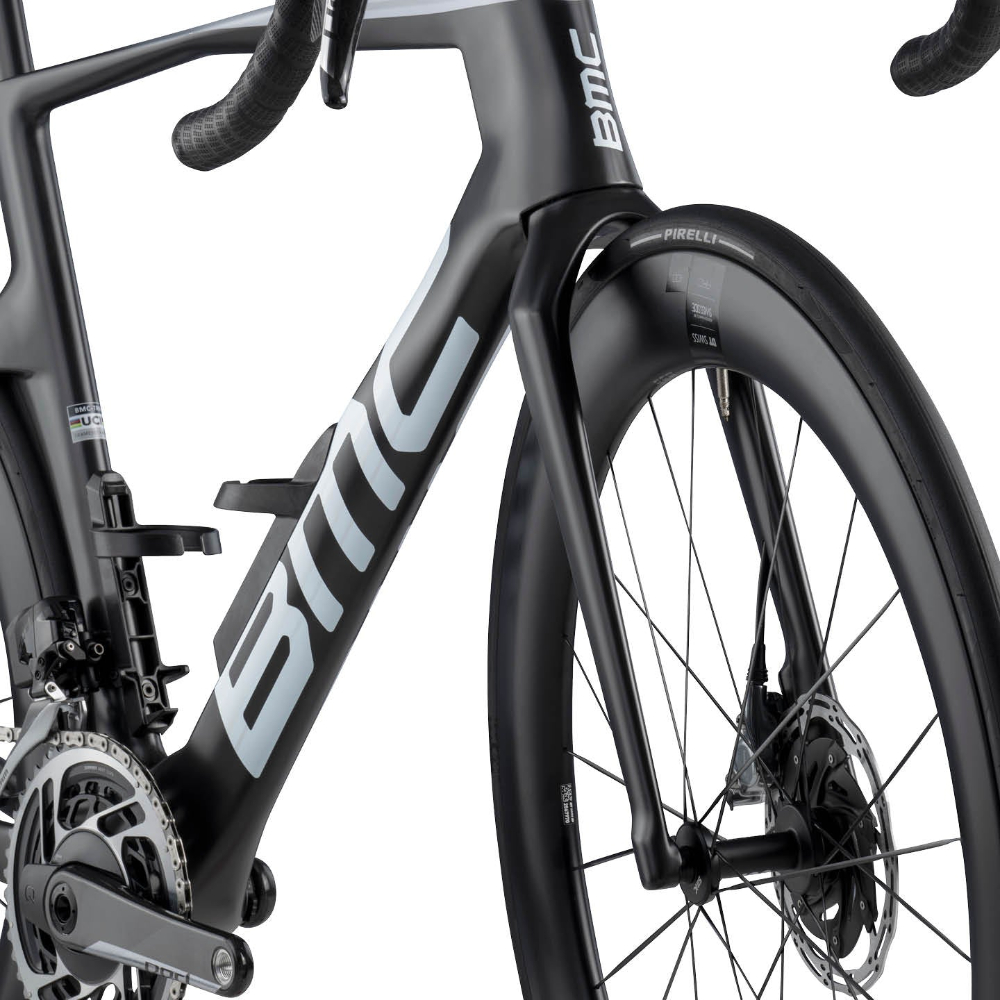 The ultrawide fork legs are unlike anything else seen in the peloton and help keep turbulent air, created by the front wheel, away from the frame.