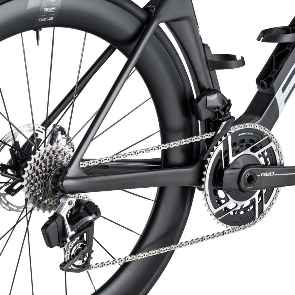The ultrawide fork legs are unlike anything else seen in the peloton and help keep turbulent air, created by the front wheel, away from the frame.