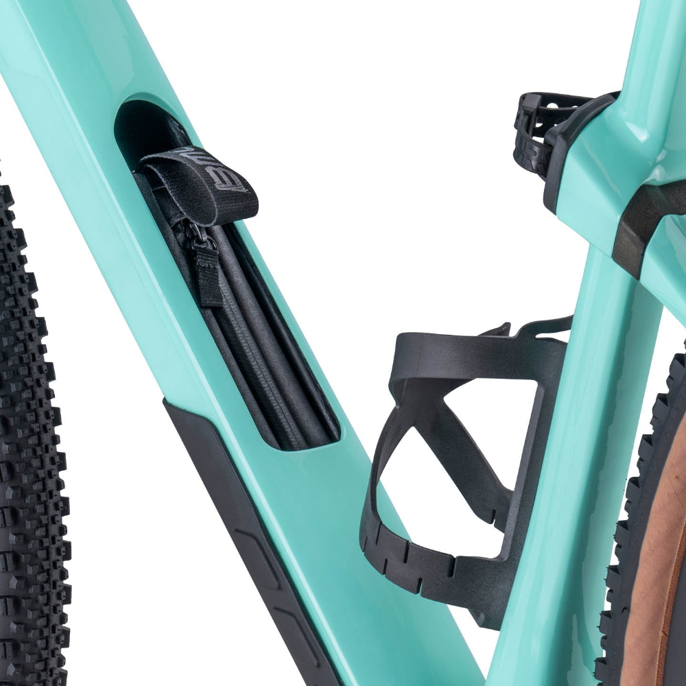 Secret storage? We've got it. URS now features a seamlessly integrated storage solution in the downtube, with a purpose designed pouch and side-loader bottle cages included.