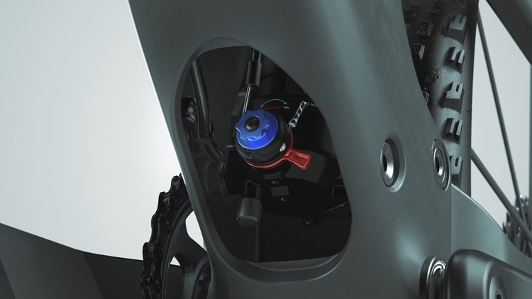 Accessing the shock via the bottom bracket area is facilitated through a hatch. This makes it easy to adjust rebound, compression, shock pressure, and for installing or replacing the cable for our TwinLoc Suspension System.