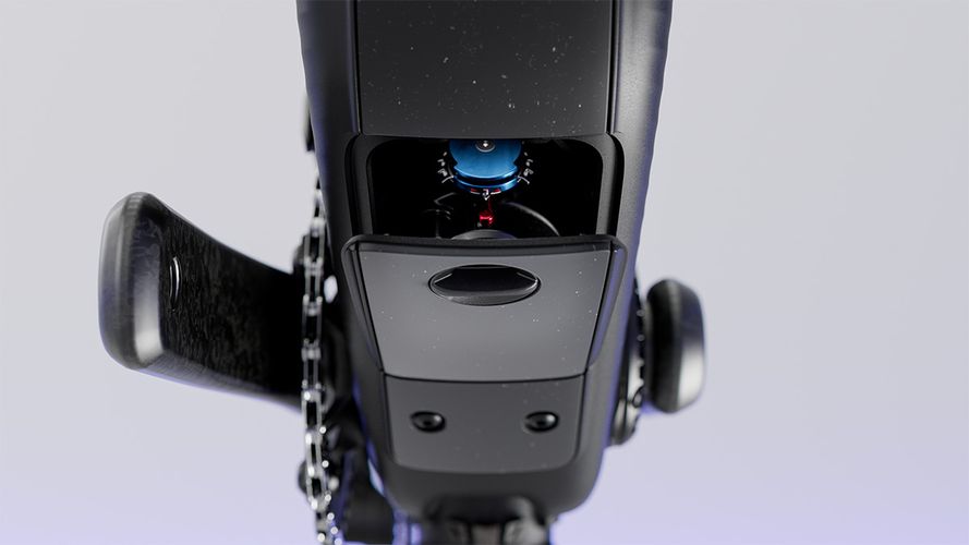 With the Voltage, accessing our patented integrated shock is easier than ever. Just push the button, pop off the cover, and access is yours. From here, adjusting rebound, air pressure, etc. is a mere button push away.