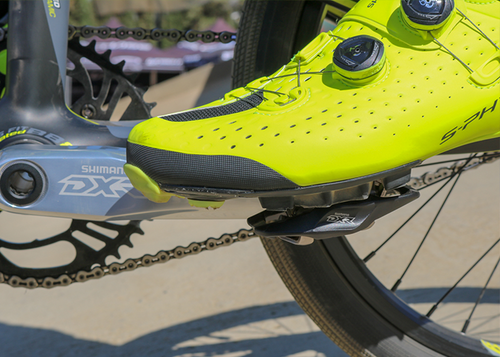 A wide pedal-to-shoe contact area provides more support and grip when you're pumping and pushing hard through the rollers. The slim platform and cage creates a low stack height for increased pedaling stability and efficiency. The integrated cage enhances control when you're not clipped in - it also protects the binding mechanism against impact.