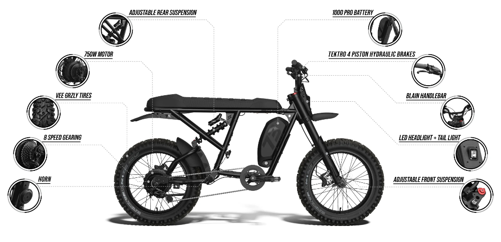 *Battery range estimates depend on conditions such as rider weight, speed, temperature, wind, tire pressure, terrain, incline, etc. Acceleration increases based on comparison to previous powertrains used in SUPER73 products. Acceleration increases may vary depending on rider weight, riding terrain, battery state of charge, weather, and other environmental factors. Mileage may vary. All bikes are subject to minor cosmetic changes.