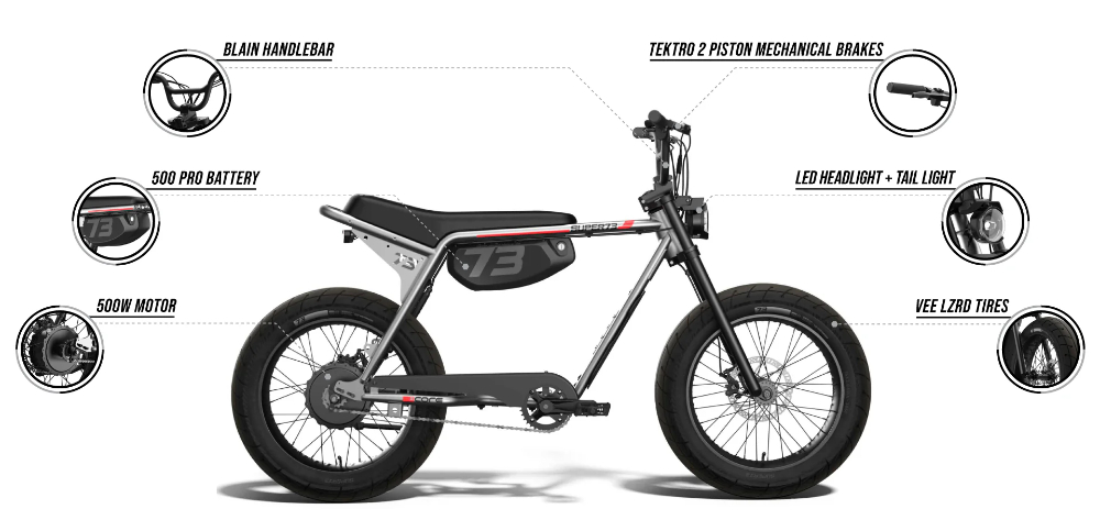 *Battery range estimates depend on conditions such as rider weight, speed, temperature, wind, tire pressure, terrain, incline, etc. Acceleration increases based on comparison to previous powertrains used in SUPER73 products. Acceleration increases may vary depending on rider weight, riding terrain, battery state of charge, weather, and other environmental factors. Mileage may vary. All bikes are subject to minor cosmetic changes.